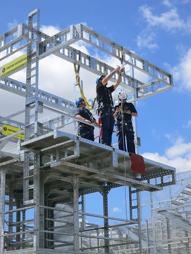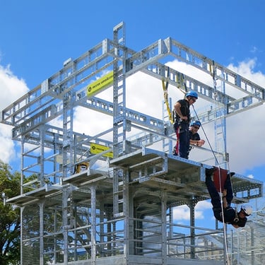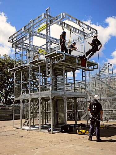 Constructed from hot-dipped galvanised steel for durability, each frame section features precision 18mm pre-drilled holes at 80mm centres, making it fully compatible with the superAccess component range. The system can be configured for virtually any application — from compact gym fit-outs to multi-storey outdoor training towers up to 30 metres high.